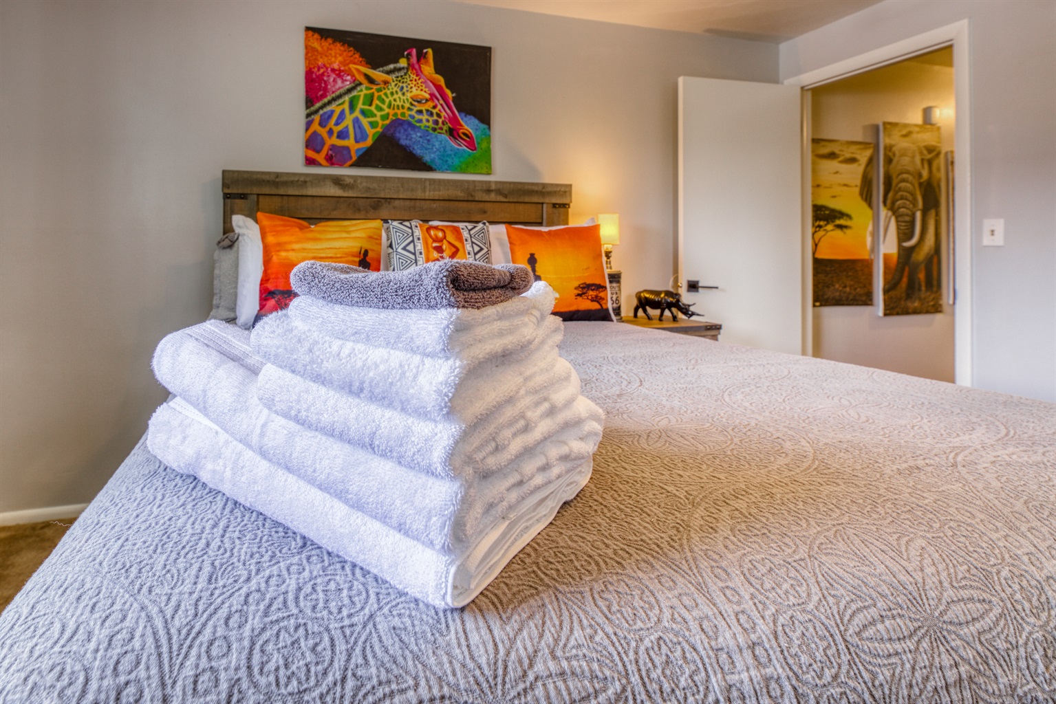 Our Kenyan-inspired spaces are intentionally designed to feel warm, grounded, and stable during transition—using color and authentic artwork sourced directly from Kenya to create an environment that feels lived-in and human rather than neutral or impersonal.